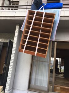 二階からの搬出でしたが、階段が狭く搬出が難しいかったのと二階にベランダがあり、安全に吊り下ろしができる場所でしたので吊り下ろしでの搬出となりました。